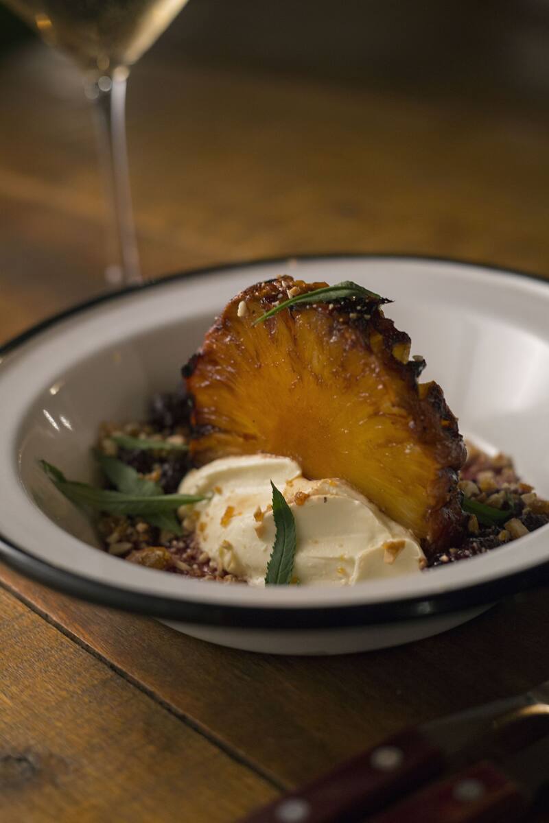 De postre, protagonizan el menú el panqueque a la plancha con dulce de leche o el ananá a la parrilla con frutos rojos, mascarpone y praliné.