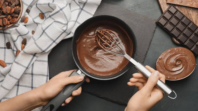 Derretí el chocolate a baño María o en microondas (en intervalos de 30 segundos, revolviendo cada vez).