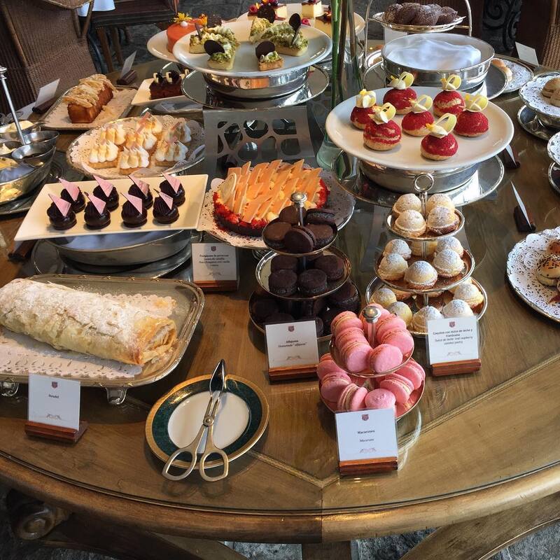 - Una selección de dulces presentada en una bandeja de tres pisos: pan dulce, scones, cheesecake, macarons, lemon pie, cannoli de chocolate y dulce de leche, marquise de chocolate y frutos rojos.