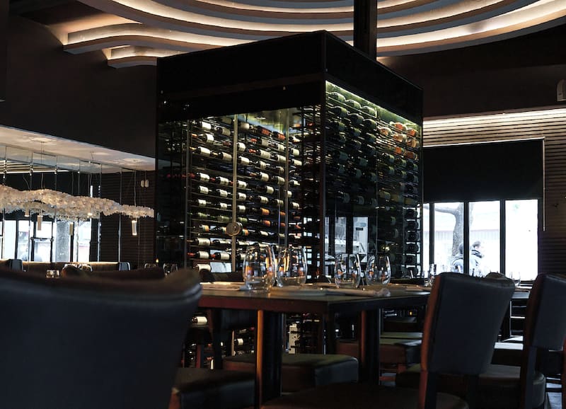 Al ingresar al salón principal la atención se desvía instantáneamente a la cava de vinos ubicada al centro, la cual cuenta con vinos federales que rinden homenaje a las provincias argentinas. El revestimiento de espejos en las paredes junto con la tenue iluminación cálida brinda un ambiente íntimo. La parrilla abierta y a la vista de los comensales devela los secretos de quienes conjugan la magia en los fierros a punta de brasas de leña.