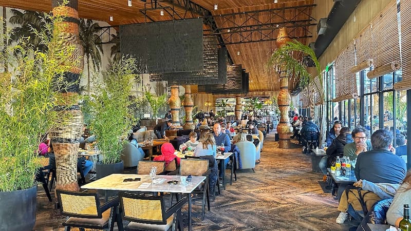 El salón principal es un gran espacio con su techo recubierto de madera y mimbre junto con mucha vegetación y su amplio ventanal para que toda la luz y las visuales del rio ingresen hacia el interior. Sus mesas bien espaciadas y sus cómodos sillones, convierten a ese restaurante en una buena opción para los días de frio o lluvia.