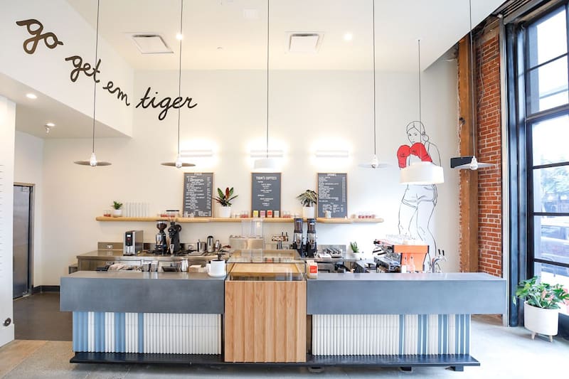 Con mucha madera y modernas lámparas que representan moléculas de cafeína y cuelgan sobre la barra, el Case Study Coffee de Portland fue diseñado con una vibra de mediados de siglo que hace un guiño a las icónicas cafeterías de la época.