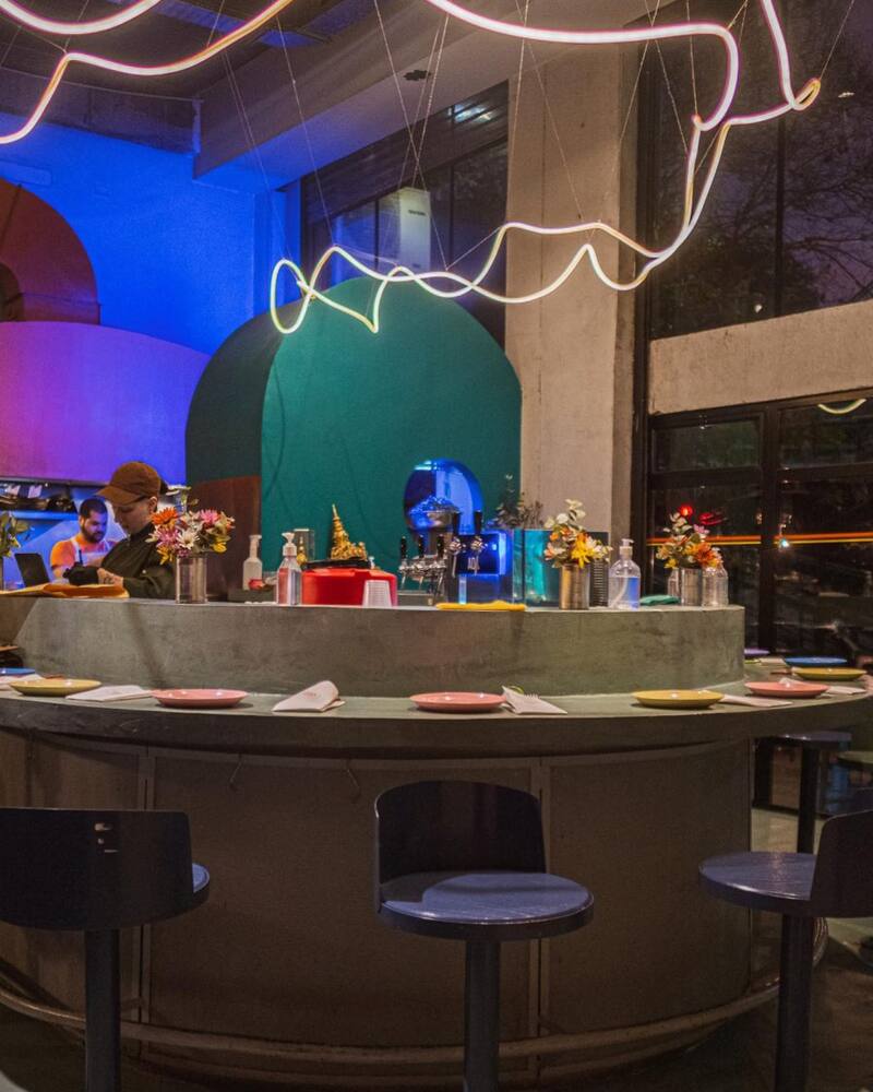En un local más bien íntimo, su barra semi circular es la estrella indiscutida, que alberga además el 50% de la disponibilidad del lugar. Adornada de platos y cubiertos de colores que trajeron sus dueños, José Delgado y Thomas Nguyen, de los países que inspiran el menú, esta deja a la vista todo el proceso de preparación, tanto de las bebidas como de sus platos abundantes. Las luces colgando irregularmente del techo y el espectáculo detrás de la barra, lo hacen un lugar ideal para ir solo. Incluso, es lo que sucede en muchos casos, según confiesa José.