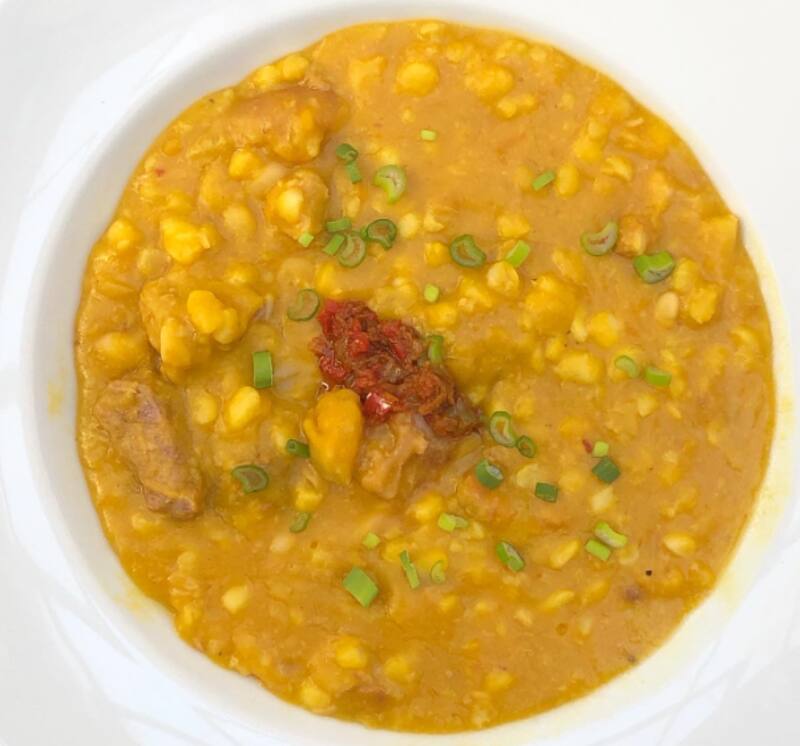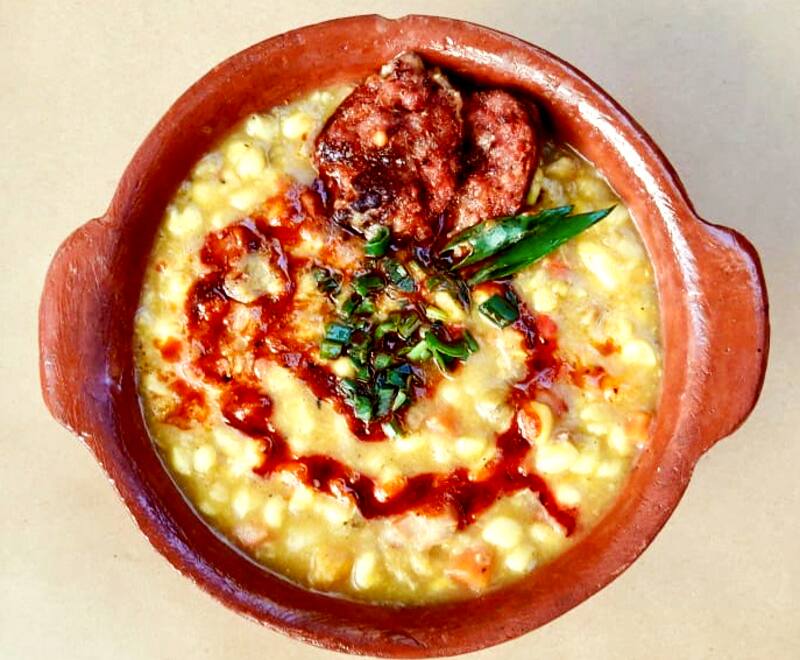 - Locro con torta frita. (Falda, panceta ahumada, chorizo colorado, mondongo, patitas de chancho, porotos)
