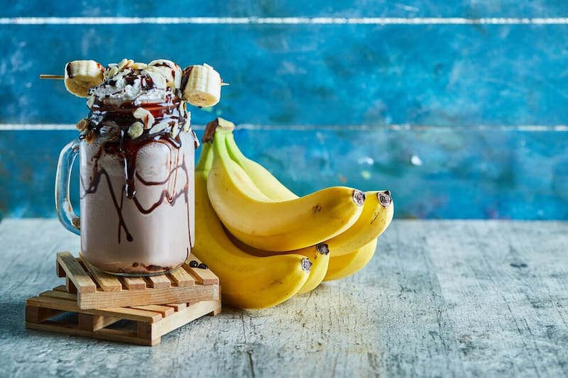 La banana y el chocolate son aliados fundamentales para ganar masa muscular por su alto valor nutricional y su sabor. A esta preparación se le puede añadir un scoop de proteína para elevar su valor proteico.