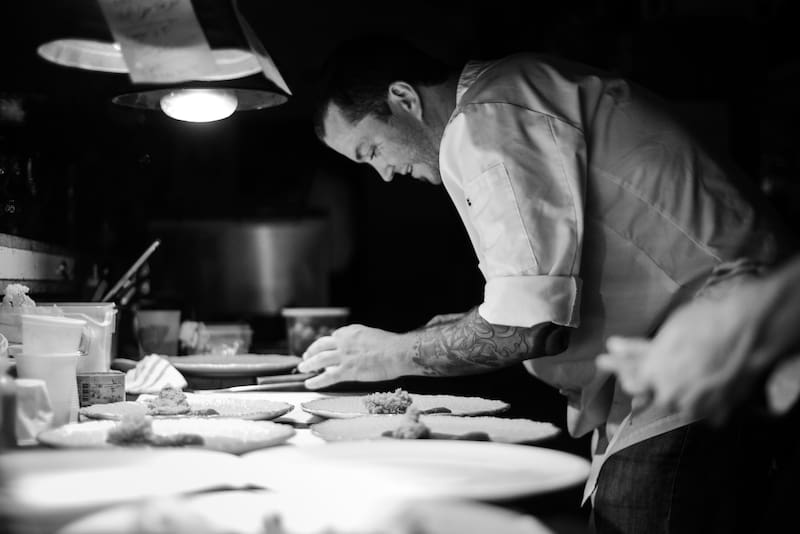 Lo alucinante es que acá todo sucede a la vista: los platos se terminan y se emplatan en grandes mesones dentro del salón, junto al fuego y frente a los comensales.