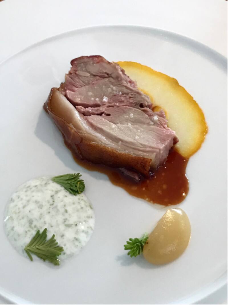 A continuación, las delicias del mar. Un fricasé de mariscos con pesto y albahaca provenientes del jardín del restaurante, un calamar de Bordighera con salsa Bagna Cauda y una scorpaena, un pescado de la región, que se apoya sobre una espuma de apio, nabo y salsa ahumada de conchas. Para cerrar, panza de cerdo con salsa de yogurt, pino y un toque cítrico.