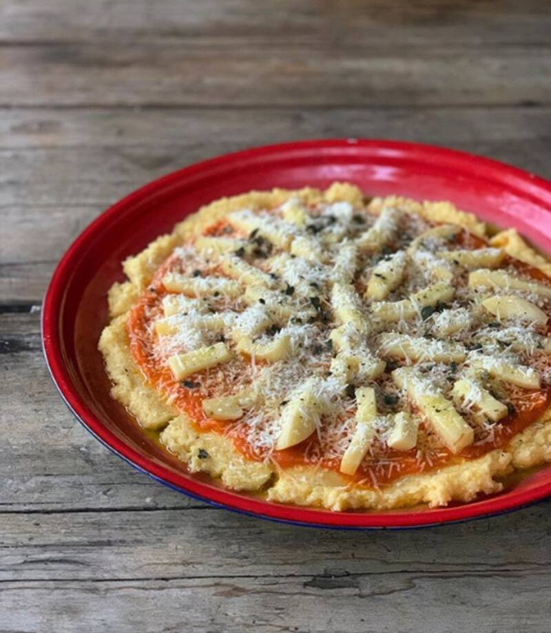 Armar la pizza colocando sobre la polenta la salsa, el queso, el orégano, un poquito de oliva. Llevar a horno fuerte hasta dorar.