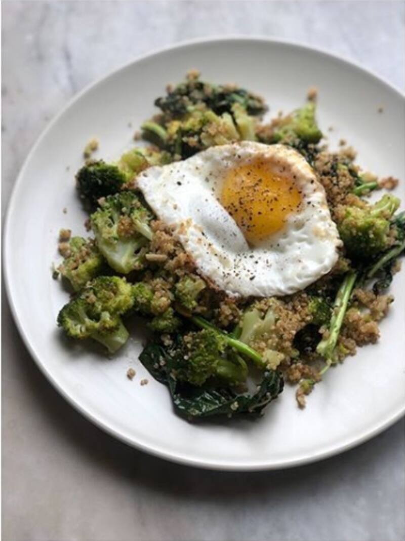 - Saltear las hojas crudas del brócoli y agregar el ajo picado sin que se queme. Incorporar la quínoa y el brócoli cocido.