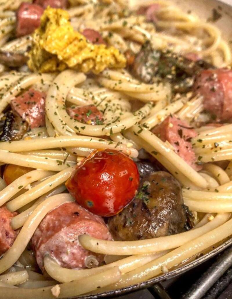 - Una vez logrado el punto de los fideos colás y mezclás todo, agregás crema, una cucharadita de mostaza y a disfrutar...