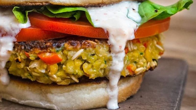 - Esto lo vas a mezclar con 1/2 zuchini limpio, crudo y rallado, 1 huevo, 1/4 de morrón rojo cortado en cubitos, sal y si querés, curry o comino. Hacés 2 medallones, los ponés en una placa aceitada o con papel de hornear y las mandás al freezer por unos 15 minutos. Las sacás y mandás a dorar a una sartén o plancha bien caliente. Mientras tanto, mezclás 2 cucharadas de yogurt con 1 ajo rallado o picado chiquito, un poco de ají molido, comino y sal.