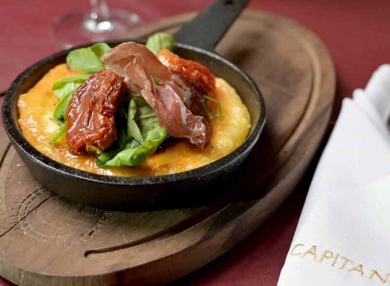 En Almagro, La Capitana ofrece una provoleta La Capitana, un plato único con queso provolone macerado en oliva, orégano y pimentón ahumado, sellado en plancha de hierro y gratinado al horno de barro.