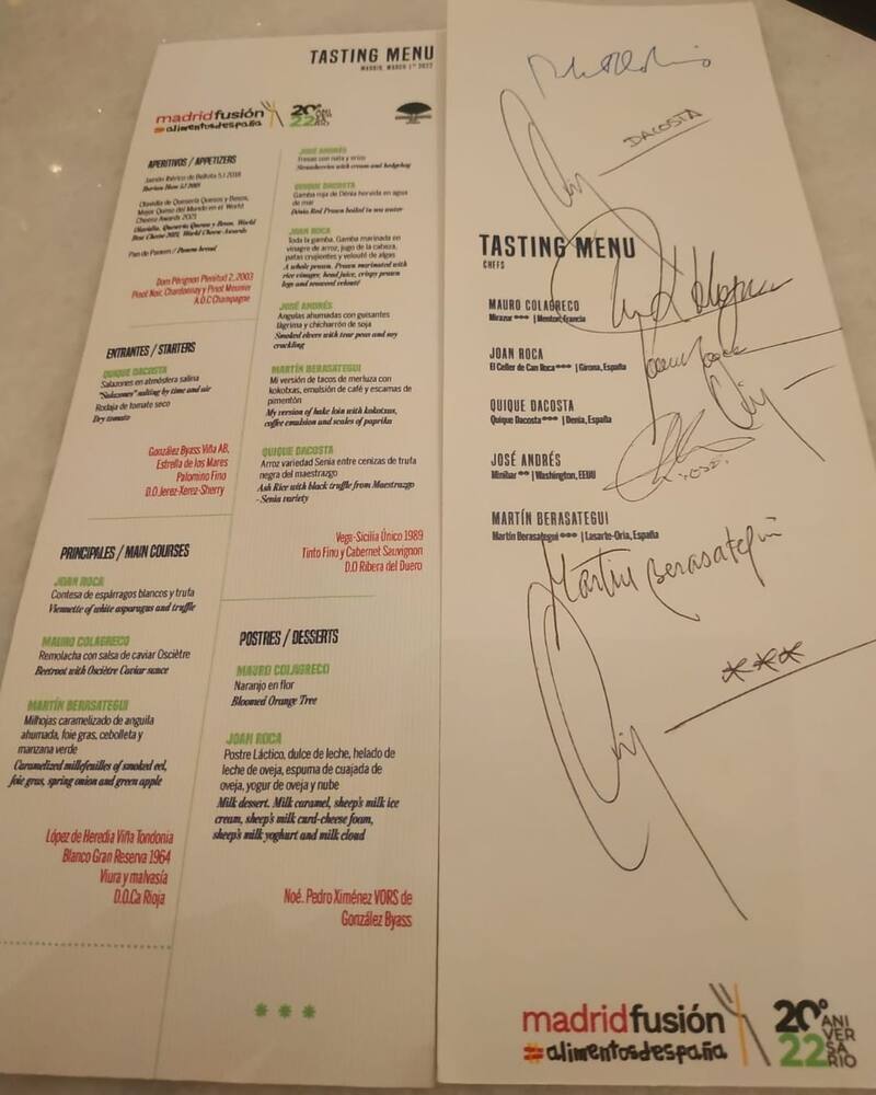 El comienzo fue con un jamón ibérico de bellota y queso Olavidía. Luego vinieron salazones en atmósfera salina y rodaja de tomate seco, contesa de espárragos blancos y trufa, milhojas caramelizado de anguila ahumada, y fresas con nata y erizo.