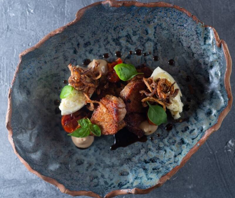 Ubicado en una casona de la Belle Époque, Casa Cavia recibe a los enamorados con un menú diseñado por Julieta Caruso. El primer plato, para compartir, es una crema de garbanzos, hojas de akusai, hierbas, brotes, frutos secos, verduras frescas y encurtidas. El segundo,