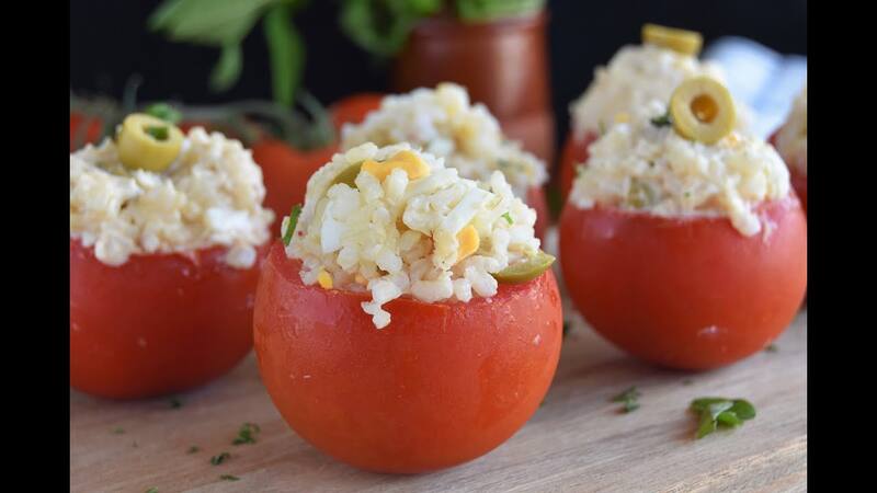 3. Colocar el relleno en los tomates y por encima agregar las aceitunas. Llevar a la heladera y servir frío.