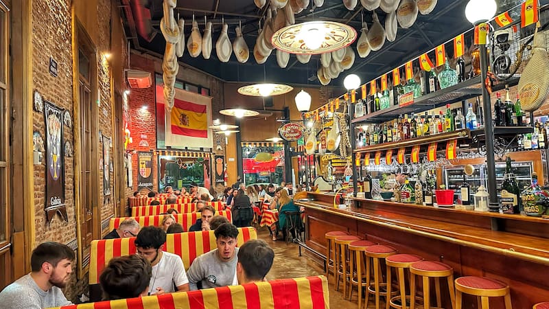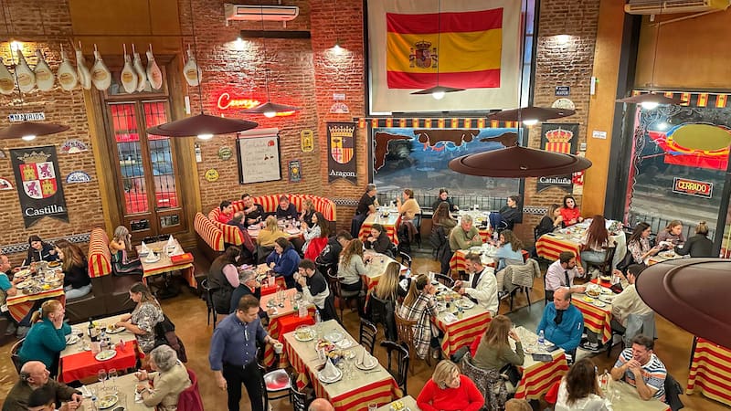 Su salón, con una capacidad para 150 comensales, propone una decoración inspirada en temáticas españolas. En sus muros de ladrillo a la vista, se pueden apreciar diversos escudos de las regiones como Cataluña, Galicia, León, Aragón, etc.Además, de una gran cantidad de jamones colgando e incluso, manteles de las mesas con los colores rojos y amarillos. Luminarias con fileteado y grandes ventanales que llenan de luz el espacio interior.