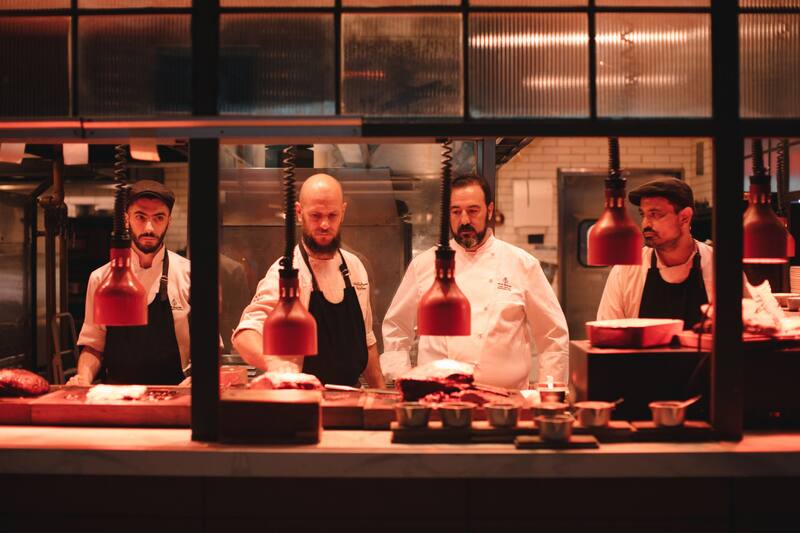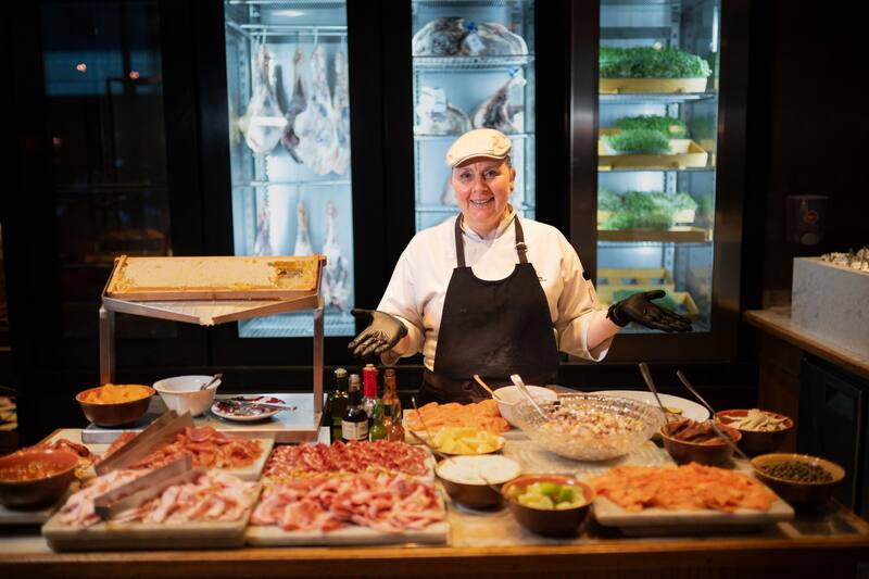 Alrededor de la cocina habrá diferentes estaciones con productos y platos fríos y calientes: desde la exquisita charcuterie de Elena, con quesos de todo tipo, frutos secos y fiambres de calidad premium; ensaladas; mariscos como ostras y langostinos; carnes dry-aged a la parrilla; hasta pizzas y pastas caseras y panes artesanales.