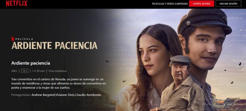 Ardiente Paciencia,dirigida por Rodrigo Sepúlveda,está basada en la novela homónima del escritor Antonio Skármeta. El film cuenta la historia de un joven cartero que buscará cumplir su sueño y conquistar a la mujer de su vida con la ayuda de Pablo Neruda.