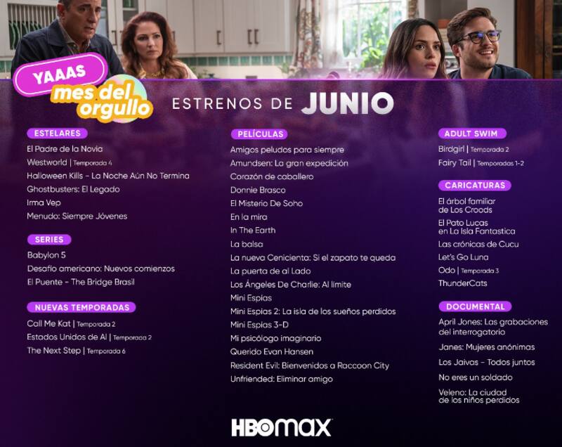 Los estrenos estelares de HBO Max son El Padre de la Novia, que estará disponible el próximo jueves 16 de junio. Será la versión Latinoamérica de la comedia romántica que protagonizaron Spencer Tracy y Elizabeth Taylor en 1950, esta vez con las actuaciones de Diego Boneta, Adria Arjona, Gloria Estefan y Andy García.