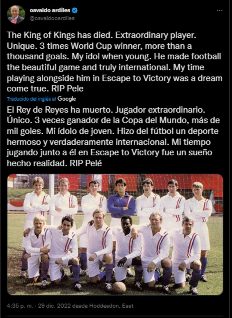 Inmediatamente, las redes sociales se inundaron de mensajes para despedir a Pelé, quien no solo se dedicó al fútbol, sino que también a lo largo de su vida se abocó a otras áreas: la música, la actuación y las inversiones inmobiliarias, entre otras. Una de las películas más recordadas donde participó el ex delantero de Santos, y que llevó a Hollywood, fue Escape a la victoria.