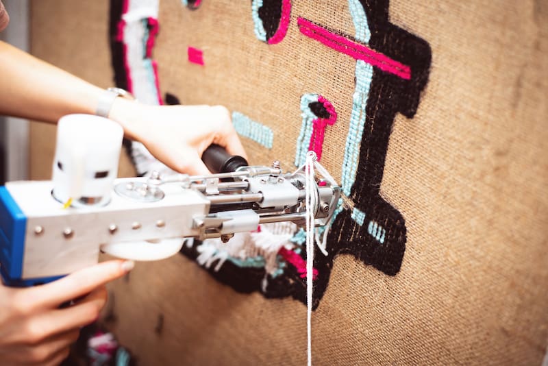 El tufting es una técnica artesanal para fabricar alfombras y tapices mediante la inserción de hilos en una tela base. Se utiliza una herramienta llamada tufting gun, una pistola semiautomática que perfora la tela tensada e inyecta el hilo, creando bucles o puntadas que dan forma al diseño. El resultado depende del tipo de aguja, la lana y los colores elegidos, lo que permite una personalización total.