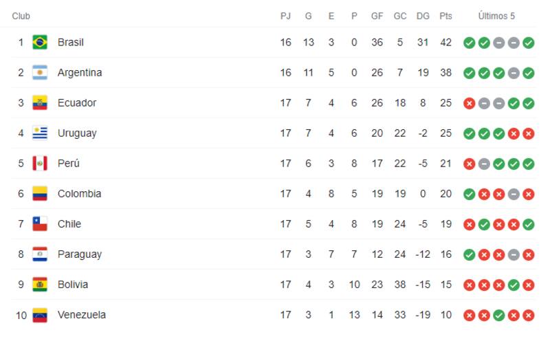 Tabla de posiciones Eliminatorias sudamericanas Qatar 2022