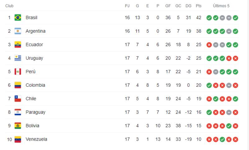 TABLA DE POSICIONES ELIMINATORIAS SUDAMERICANAS QATAR 2022