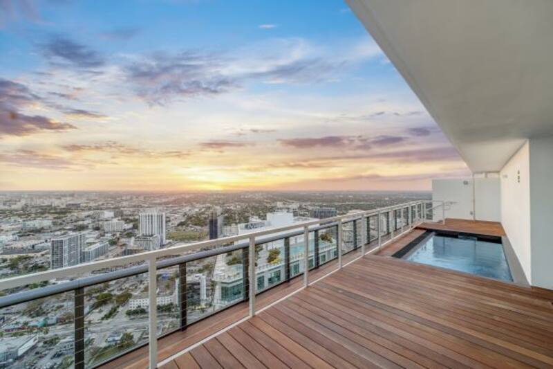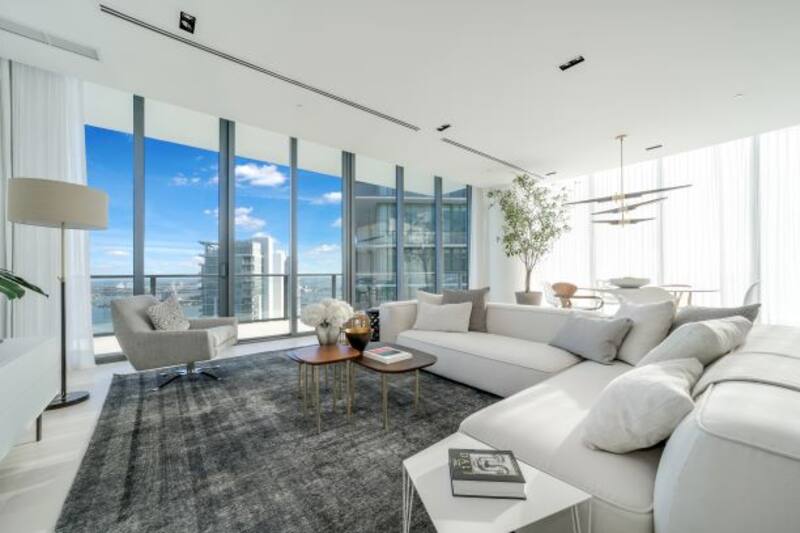 Ocupando dos niveles en los pisos 53 y 54 del desarrollo recientemente completado en Florida, la unidad de lujo fue diseñada completamente por Piero Lissoni. El primer piso, que abarca 2.387 pies cuadrados cubiertos con una terraza exterior de 429 pies cuadrados, cuenta con un vestíbulo de doble altura y una escalera envolvente, un dormitorio principal, una sala de estar y una cocina abierta.