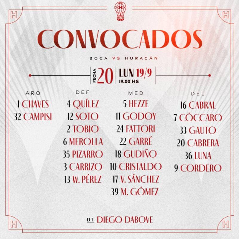Huracán informó esta tarde la lista de convocado para enfrentar a Boca por la fecha 19 de la Liga Profesional. Los cambios viene por el lado de los laterales.