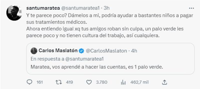 "No sabe de números, no sabe sacar las cuentas, no tiene sentido de las dimensiones de las cosas y que 400 palos es poco", había criticado Maslatón sobre el cuestionamiento realizado por Maratea de cómo Máximo logró ese patrimonio.