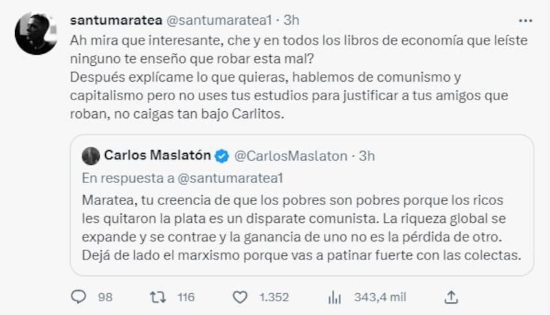 En tanto, el asesor financiero respondió: "Tu creencia de que los pobres son pobres porque los ricos les quitaron la plata es un disparate comunista. La riqueza global se expande y se contrae y la ganancia de uno no es la pérdida de otro. Dejá de lado el marxismo porque vas a patinar fuerte con las colectas", vociferó.