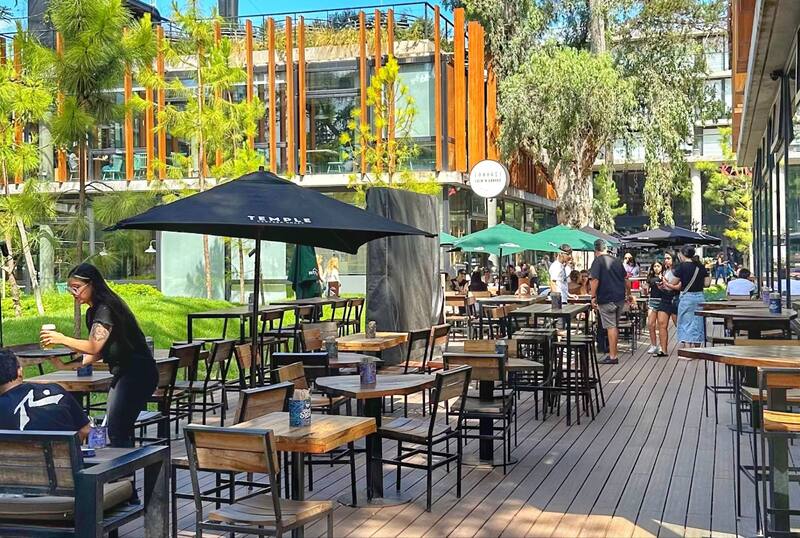 Su diseño arquitectónico y paisajístico se basa en un conjunto de edificaciones aisladas que conforman los locales comerciales gastronómicos con sus propias expansiones de decks de madera al aire libre y mobiliarios exteriores.