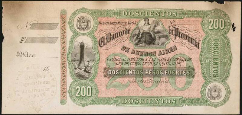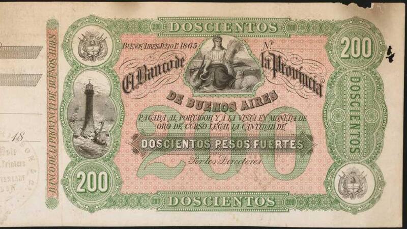 En 1865, el Banco de la Provincia de Buenos Aires prometía pagar “al portador y a la vista moneda de oro de curso legal la cantidad de 200 pesos fuertes . 153 años más tarde, el billete –impreso por la compañía inglesa Bradbury Wilkinson & Co– ha logrado sobrevivir el paso del tiempo, a excepción de unos “daños menores y algunas manchas, enexcelentes condiciones.