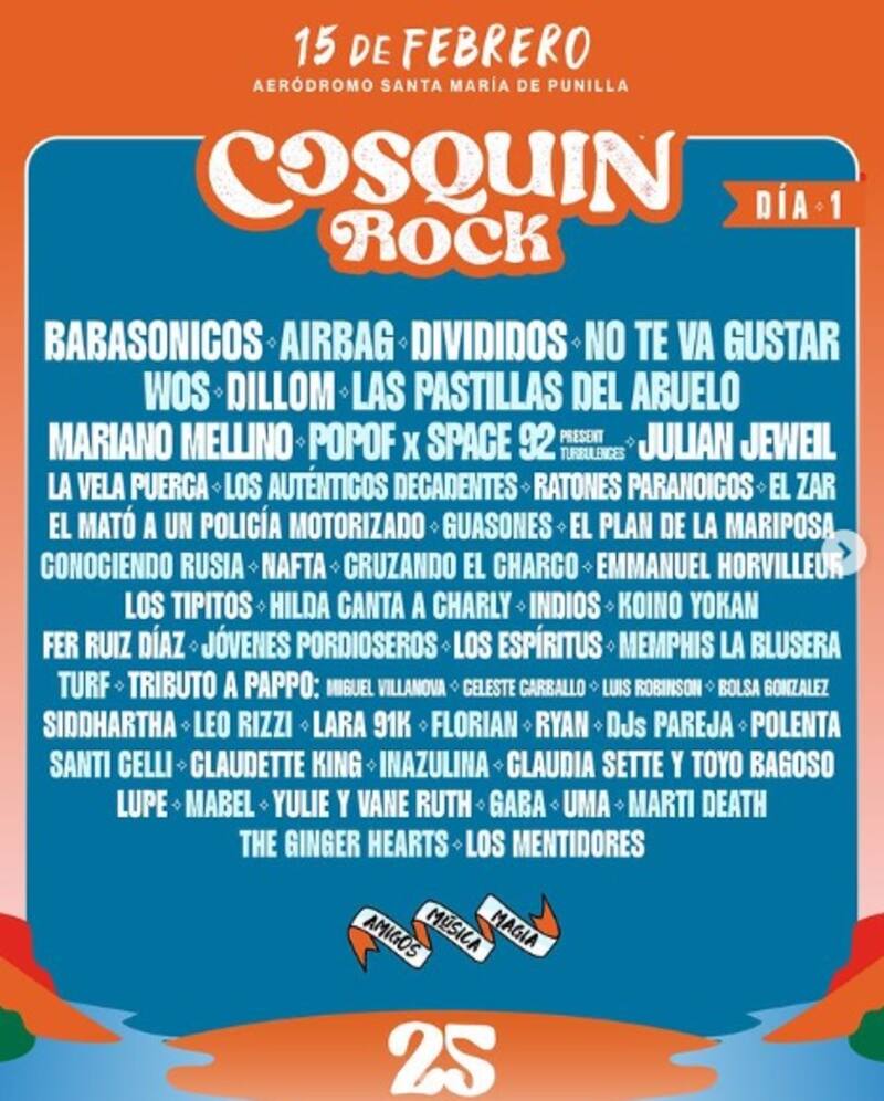 El Cosquín Rock dio a conocer cuáles artistas se presentarán en cada una de las fechas. Para el Día 1, se distinguen como principales bandas a Babasonicos, Airbag, Divididos, No Te Va a Gustar, Wos, Dillom, Las Pastillas del Abuelo y otros grupos como Nafta, El Plan de la Mariposa, Conociendo Rusia, entre otros.