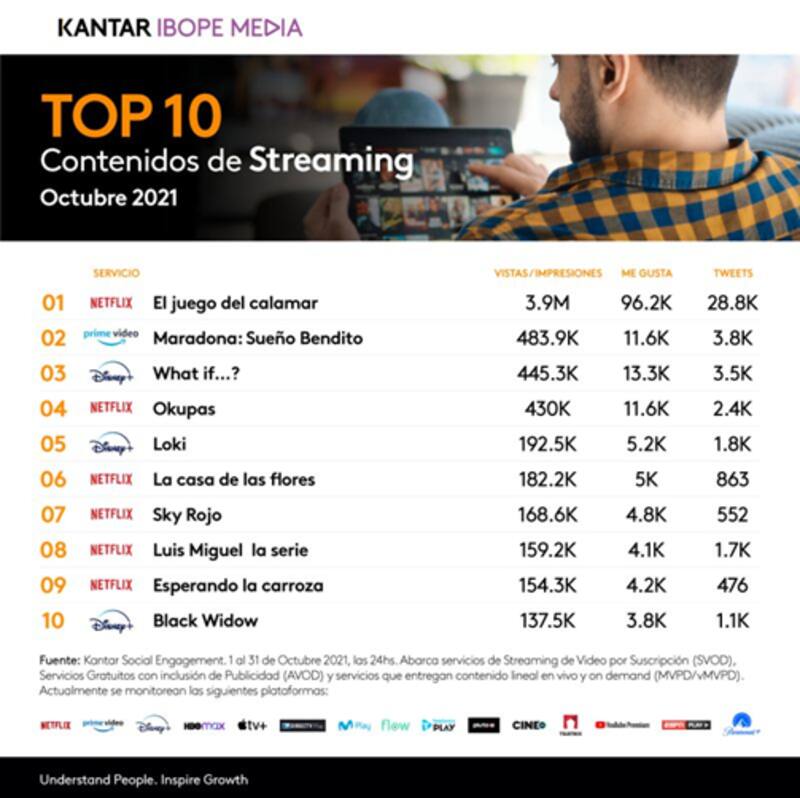 En Octubre, este ranking estuvo encabezado por "El Juego del Calamar", la serie de origen coreana que puede encontrarse en Netflix, presenta el mayor número de interacciones y menciones en redes sociales.