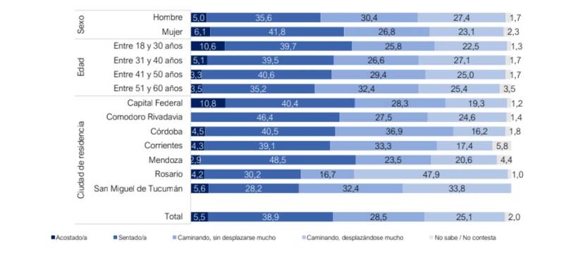 La muestra fue tomada en siete ciudades de Argentina durante la pandemia (Buenos Aires, Comodoro Rivadavia, Córdoba, Corrientes, Mendoza, Rosario y San Miguel de Tucumán) y refleja que el 44% de los encuestados se mantiene acostado o sentado la mayor parte del día.