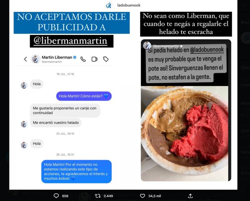 Frente a la polémica que se volvió viral en redes sociales, Liberman se justificó y aseguró que él es "un cliente insatisfecho, que pagó su helado y se lo mandaron en malas condiciones".