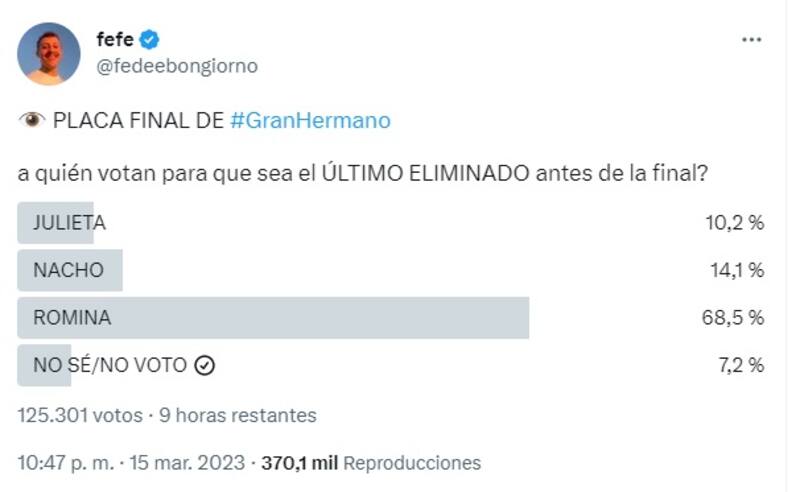 Desde que comenzó el programa, Fede Bongiorno, influencer y cronista del reality, realiza un sondeo en Twitter para determinar quién de los participantes tiene más chances de abandonar la casa en la gala de eliminación.