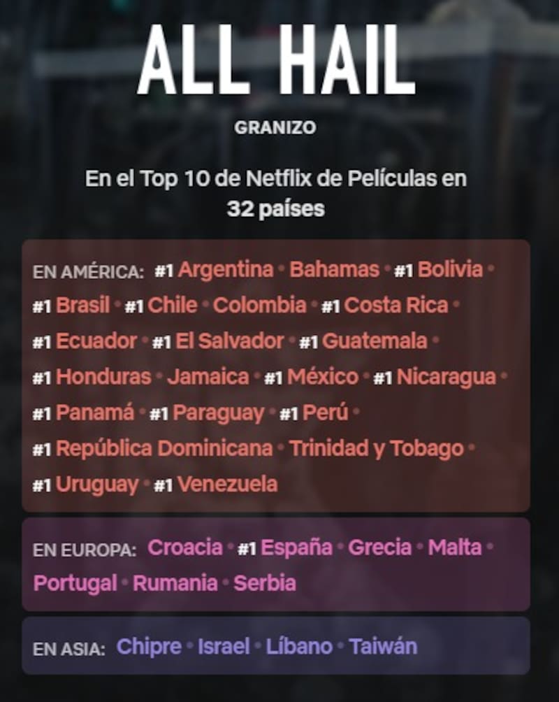 Además, en sus primeros días de estreno, Granizo se ubicó en la lista del Top 10 de Netflix de películas en 32 países: Argentina (#1), México (#1), Brasil (#1), España (#1), Perú (#1), Chile (#1), Ecuador (#1), Panamá (#1), Colombia, Grecia, Taiwán e Israel, entre otros.