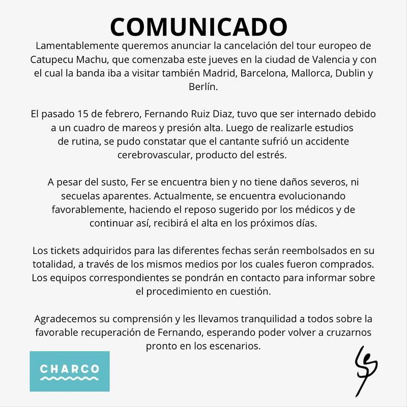 El líder y cantante de Catupecu Machu, Fernando Ruiz Díaz, sufrió un grave problema de salud y la banda confirmó que se trató de un Accidente Cerebrovascular (ACV). El grupo emitió un comunicado oficial señalando que cancelarán su gira internacional.