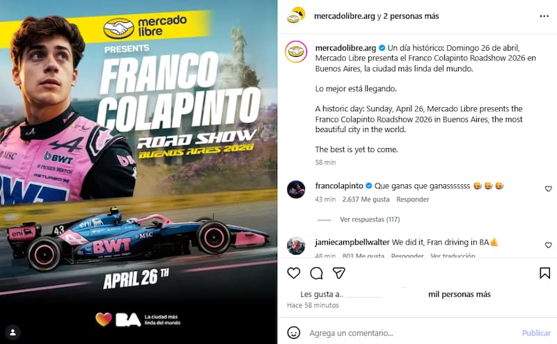 El evento "Mercado Libre presenta: Franco Colapinto Road Show Buenos Aires 2026″ fue confirmado este martes por el equipo BWT Alpine Formula One Team.
