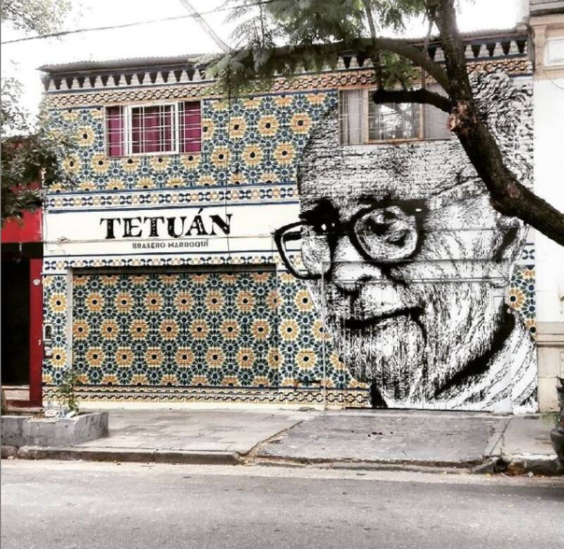 El artista argentino, especialista en la técnica del stencil (combina mensajes, imágenes y formas geométricas) fue elegido por The Bushwick Collective para pintar las paredes del barrio The Bushwick, en Brooklyn.