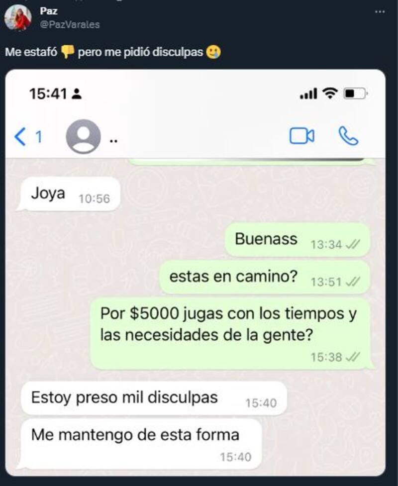 "Me estafó, pero me pidió disculpas", publicó la usuaria @PazVarales en su cuenta de Twitter. Luego adjuntó la imagen de su chat de WhatsApp con el supuesto vendedor.