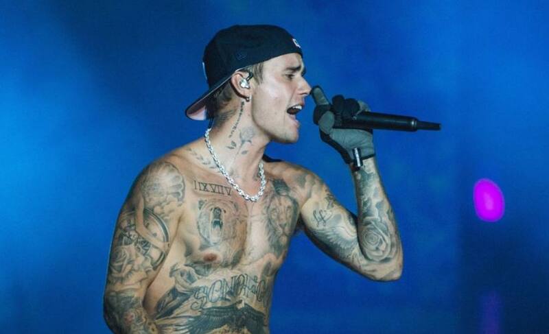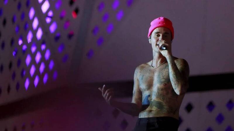 Bieber apareció en el escenario con una gorra de lana fucsia, gafas oscuras y una chaqueta de plumas que no tardó en quitarse, junto con la camiseta, hasta quedar con el torso desnudo y con su rostro completamente visible.