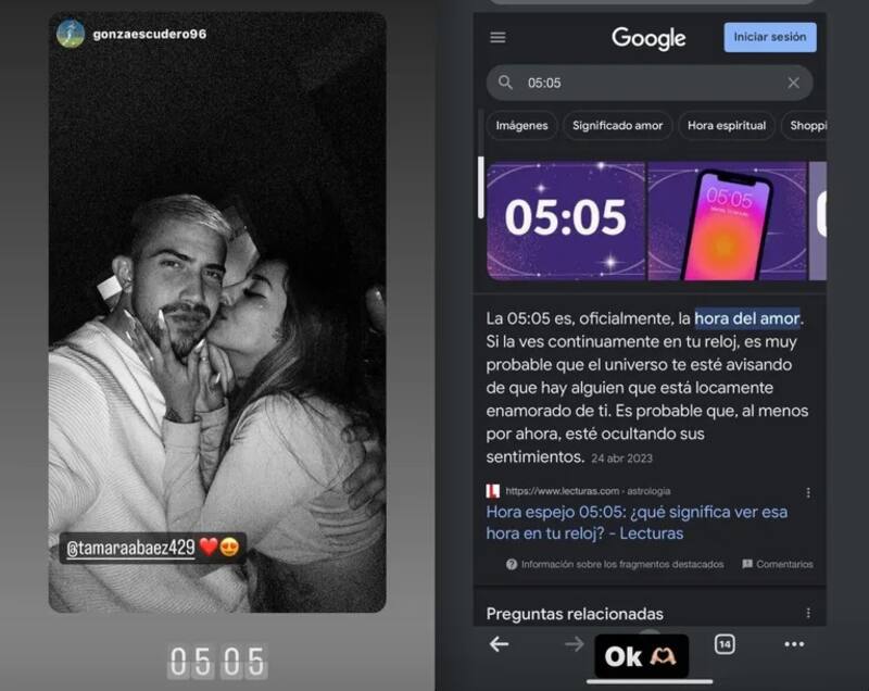También compartió una captura de pantalla con la explicación del número "05:05", la "hora del amor". "Si la ves continuamente en tu reloj es muy probable que el universo te esté avisando que hay alguien que está locamente enamorado de ti", dice la descripción, en referencia al horario en el que él subió la foto.