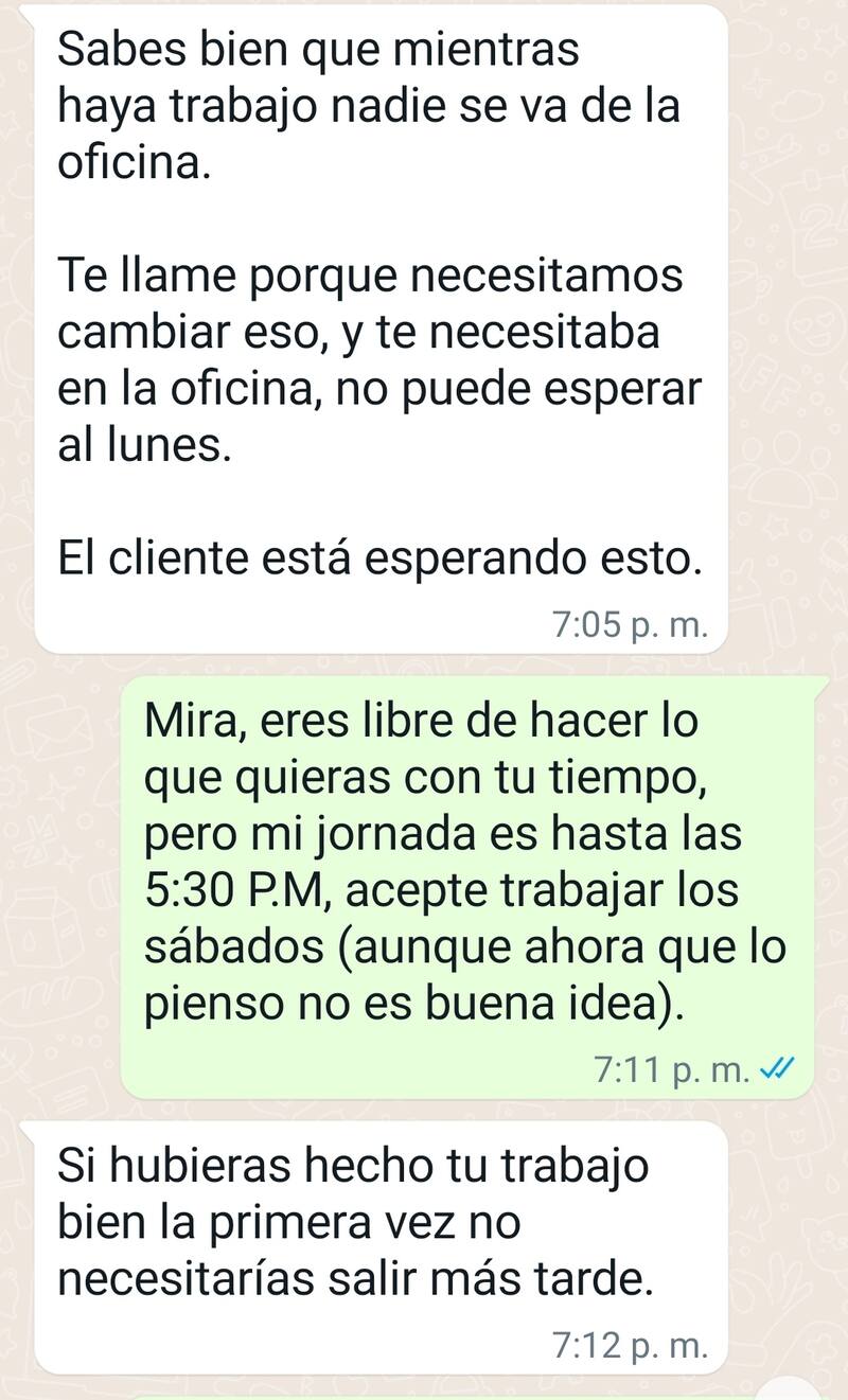 "Mira, eres libre de hacer lo que quieras con tu tiempo, pero mi jornada laboral es hasta las 5.30 PM. Acepté trabajar los sábados (aunque ahora pienso que no fue buena idea)", manifestó el empleado.