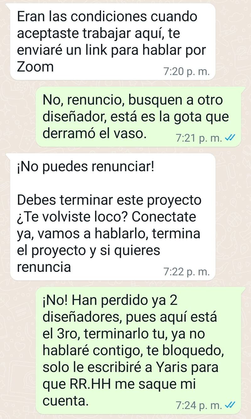 "Quizás ya no quiero. Ya no pienso trabajar sábados y domingos (más las horas extras) y seguir cobrando lo mismo", dijo el trabajador. Por su parte, el representante de la empresa respondió que había aceptado las condiciones de trabajo en su momento y ahora lo invitaba a hablar por videollamada para aclarar las diferencias.