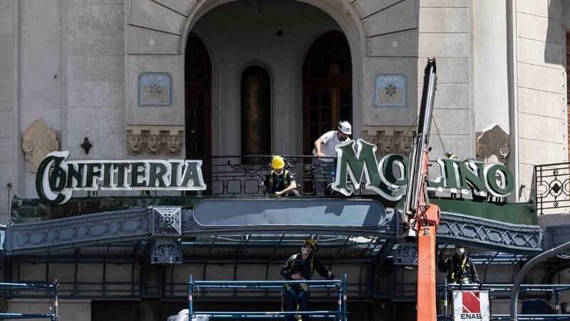 El emblemático cartel de la Confitería del Molino, en la esquina de Callao y Rivadavia, volvió a colocarse iluminado y completamente restaurado, informó la comisión Bicameral Administradora del Edificio a través de un comunicado.
