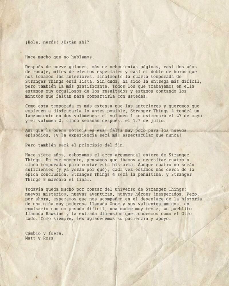 La cuarta temporada de Stranger Things está cada vez más cerca. En una carta abierta a sus fanáticos, los hermanos Duffer, creadores de la serie, revelaron cuándo se estrenarán los nuevos episodios en Netflix y compartieron novedades sobre el futuro de este éxito mundial.