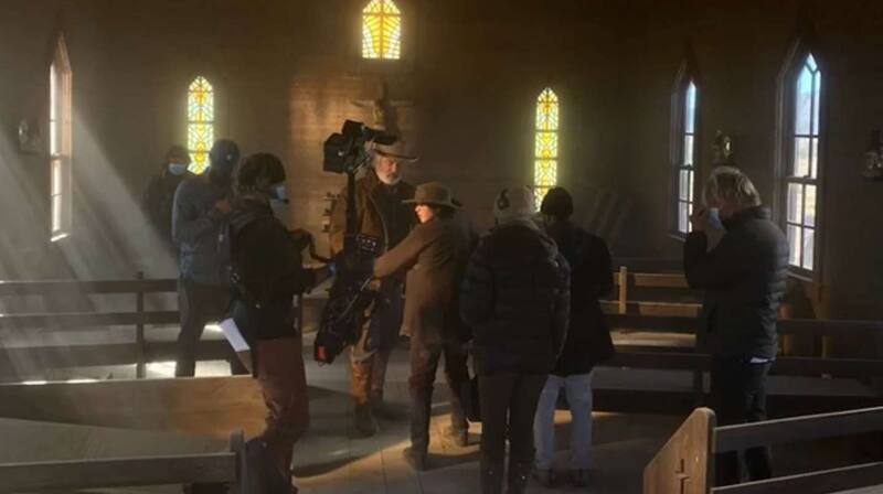 Ahí se ve a Baldwin rodeado de directores y productores. Con un gorro marrón y unos auriculares aparece Hutchins.
